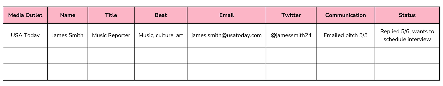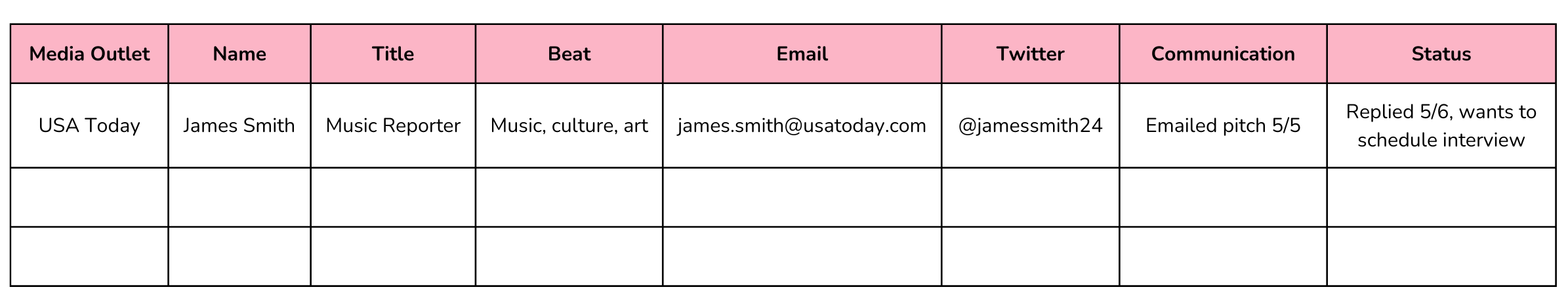 In all this research you’ve likely come across the reporter’s beat, email address, phone number and their social media handles. Create a spreadsheet with this information as a way to organize your outreach and track your communication with them.